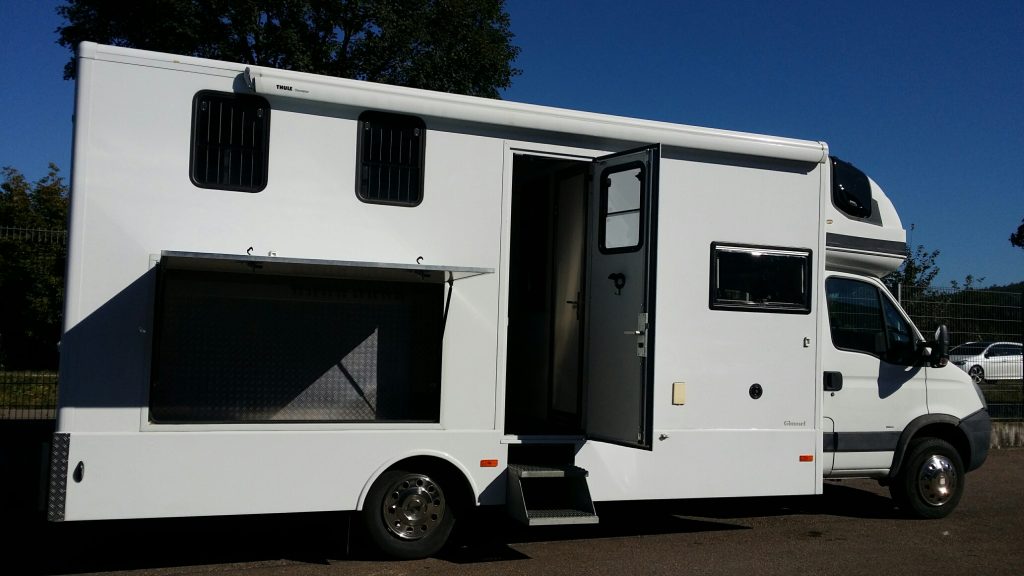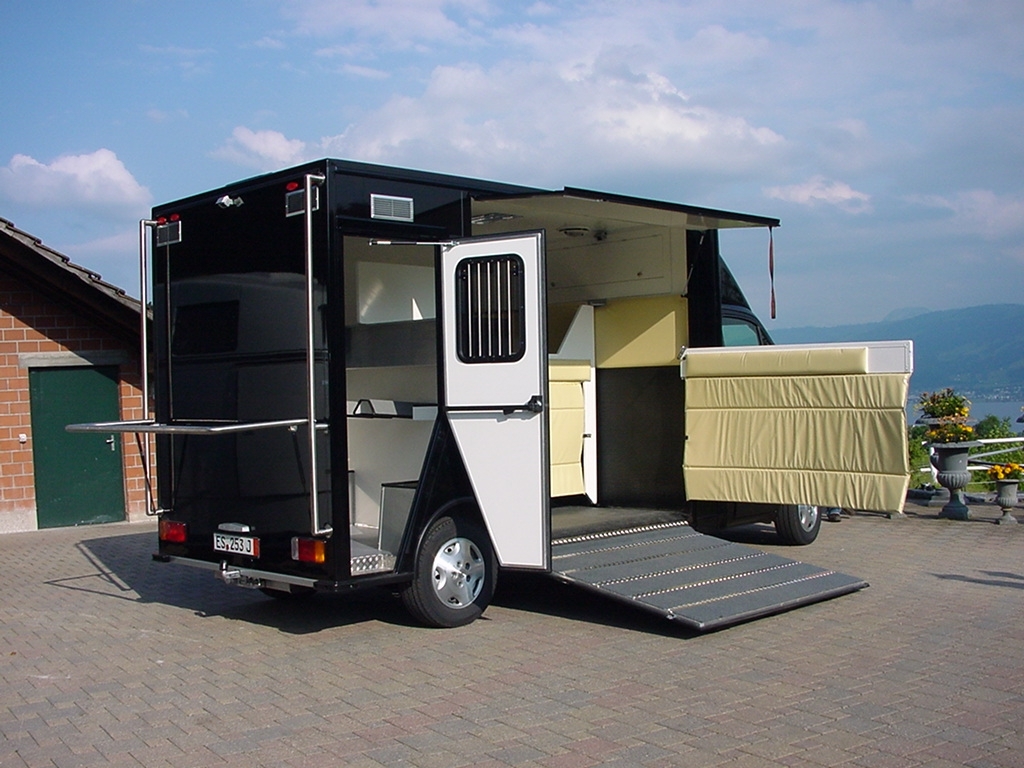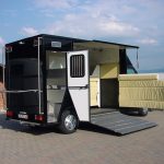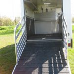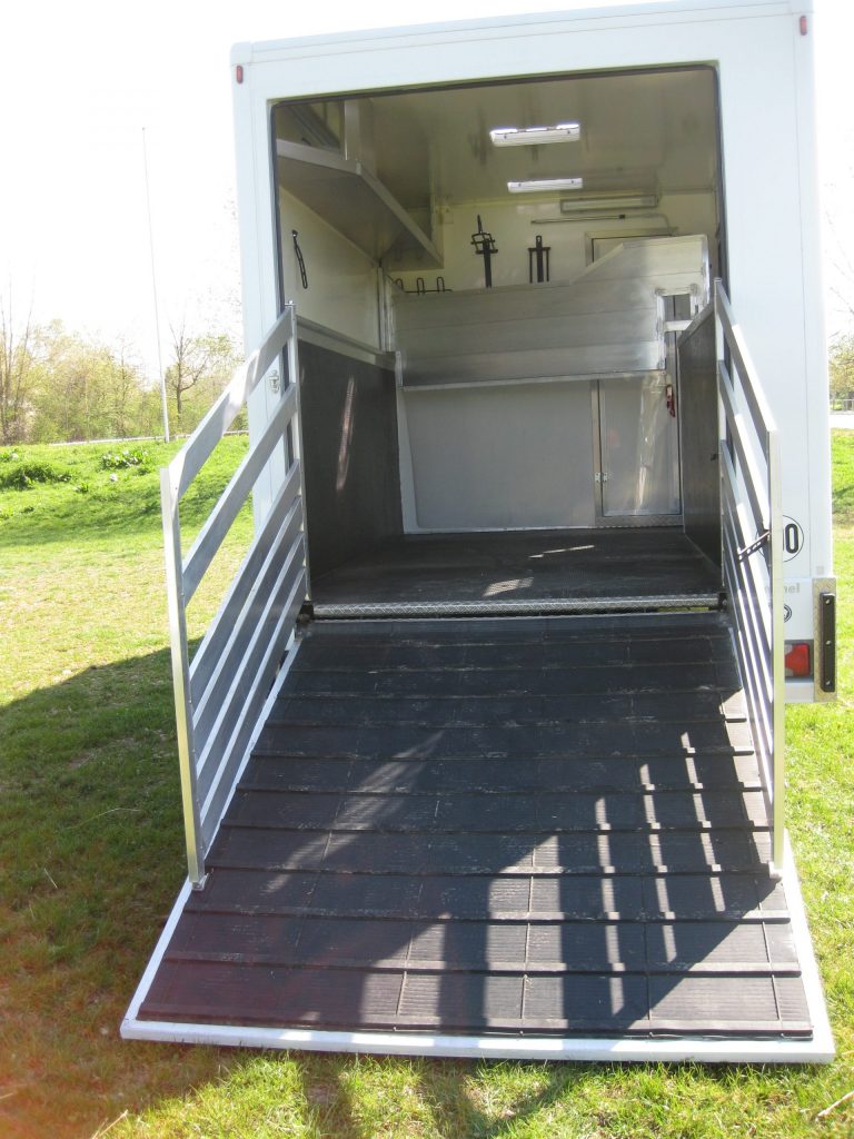 Es gibt die Ladevarianten mit einer seitlichen Laderampe, so dass eine Einzelperson zum Be- und Entladen an jedes Pferd herankommt. Die Rampe selbst ist spielerisch zu öffnen und zu schließen. Ebenso kann eine Heckrampe eingebaut werden und die Pferde können Platzsparend schräg zur Fahrtrichtung gestellt werden. Dadurch ergibt sich zusätzlich neben dem Stellplatz von 2 Pferden ein Stauraum für eine Turnierkiste oder Zubehör. Der Raum für die Pferde verfügt über ergonomische Polsterung zum Schutz der Pferde.