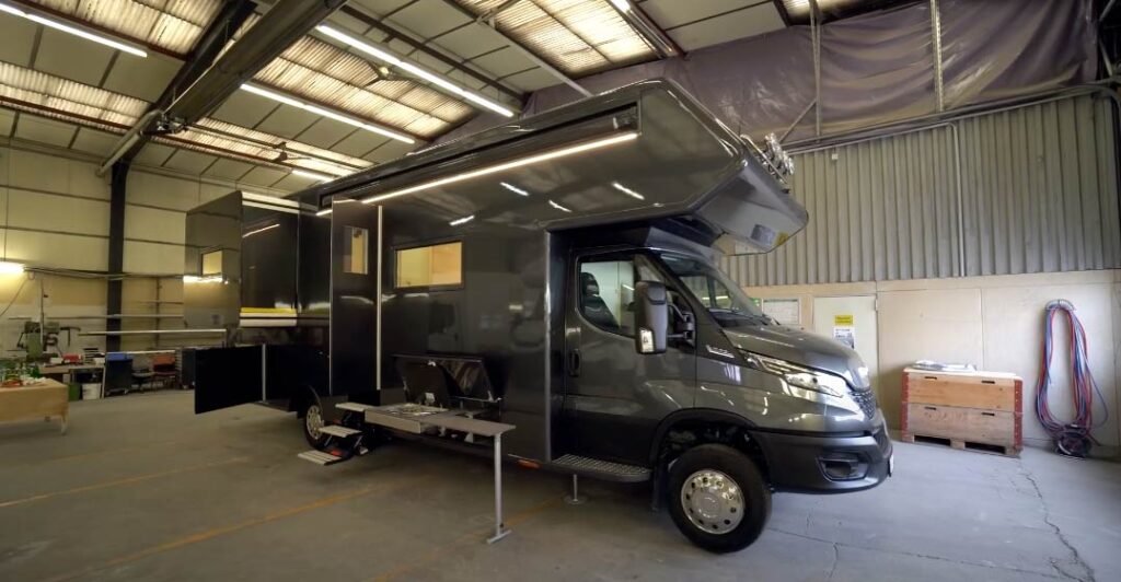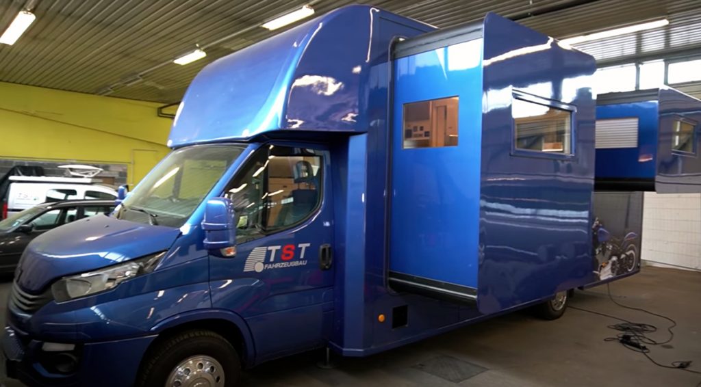 By Saarland Fernsehen, „Schönstes Wohnmobil Europas: 2 Slideout Iveco Daily TST Harley Garage Hotelschlafzimmer Design-Küche“